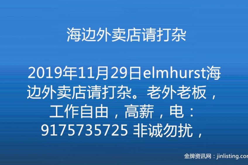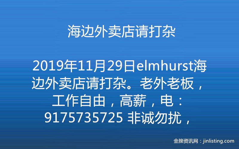 elmhurst海边外卖店请打杂。老外老板,工作自由,高薪,电:9175735725 非诚勿扰,