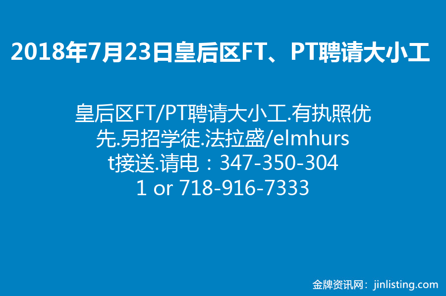 皇后区FT/PT聘请大小工347-350-3041