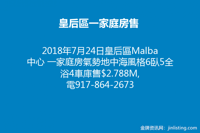 房屋公展  時間:7月28 & 7月29 下午 1:00 pm – 3:00 pm 地址:1 North Dr, Malba, NY 11357  皇后區Malba中心, 一家庭房,氣勢,地中海風格,6臥5全浴,定製廚房,女僕人宿舍,完成地下室,美麗的園景庭院,4車庫,lot size 90×109, 售:$2.788M,    電:Angie: 917-864-2673