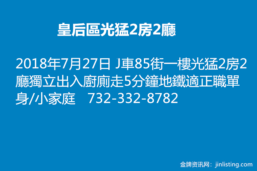 皇后區租J車85街 一樓光猛2房2廳獨立出入廚廁走5分鐘地鐵適正職單身/小家庭732-332-8782/ 732-332-8752