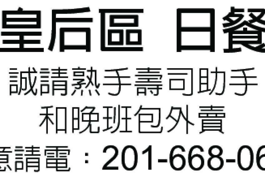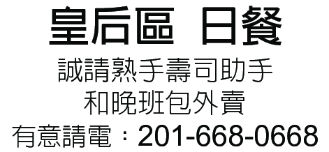 誠請熟手壽司助手和晚班包外賣。有意請電:201-668-0668