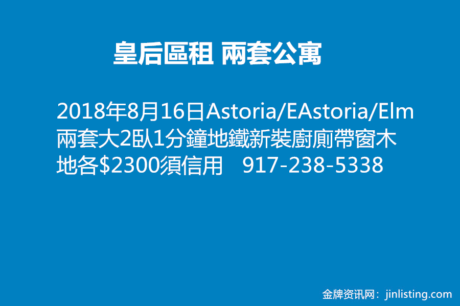 Astoria/EAstoria/Elm兩套大2臥1分鐘地鐵新裝廚廁帶窗木地各$2300須信用917-238-5338