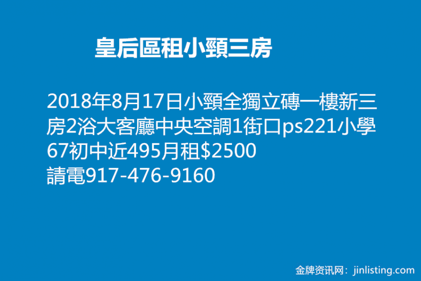 小頸全獨立磚一樓新三房2浴大客廳中央空調1街口ps221小學67初中近495月租$2500請電917-476-9160