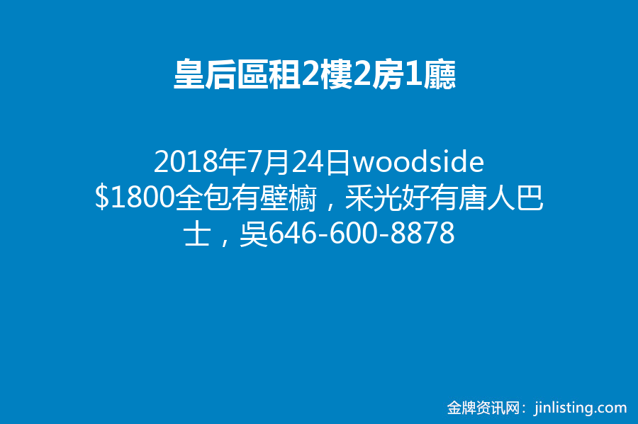 2樓2房1廳 woodside$1800全包有壁櫥,釆光好有唐人巴士去唐人街求簡單家庭,歡迎留學生,08/01入住 吳646-600-8878