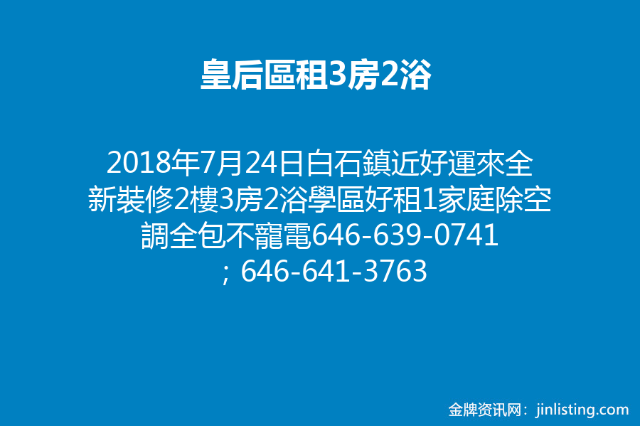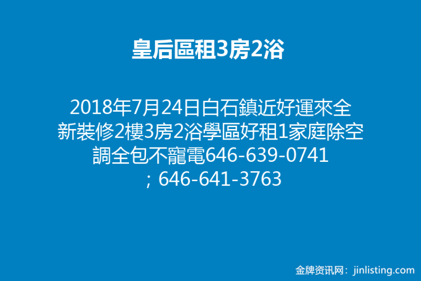 白石鎮近好運來全新裝修2樓3房2浴學區好租1家庭除空調全包不寵電646-639-0741;646-641-3763