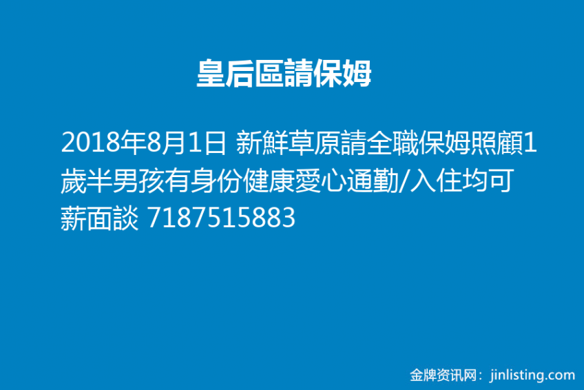 新鮮草原請全職保姆照顧1歲半男孩有身份健康愛心通勤/入住均可薪面談 7187515883