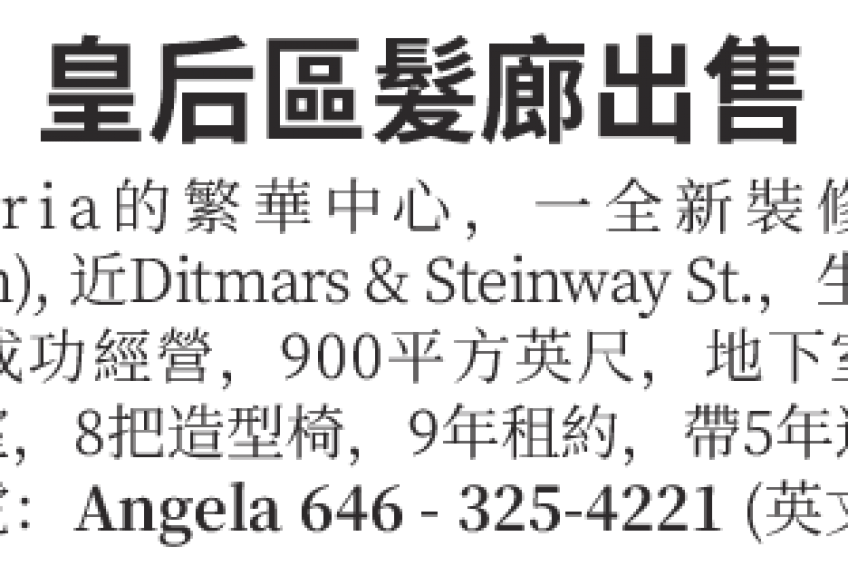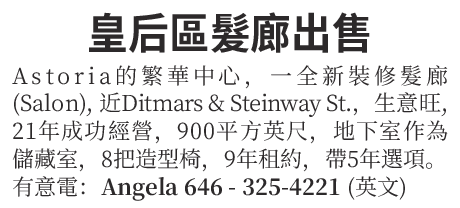 皇后區髮廊出售位於Astoria 的繁華中心,一全新裝修髮廊(Salon), 近 Ditmars & Steinway St街, 生意旺, 21年成功經營, 900 平方英尺, 地下室作為儲藏室,8 把造型椅,9 年租約,帶5 年選項。有意者,電:Angela 646 – 325-4221 (英文)