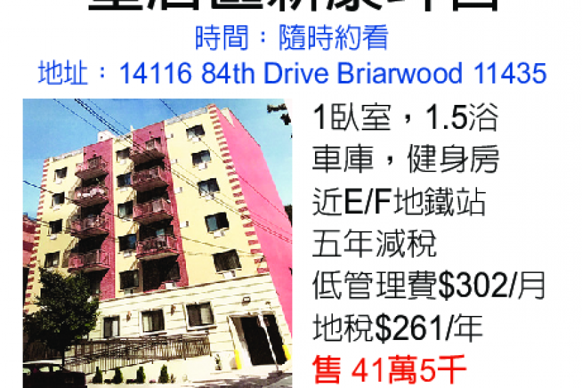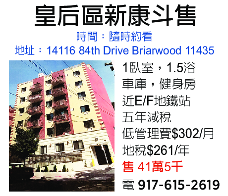1臥室,1.5浴,車庫,健身房 ,五年減稅,近E/F地鐵站,低管理費$302/月,地稅$261/年,售$41萬5千 請電917-615-2619