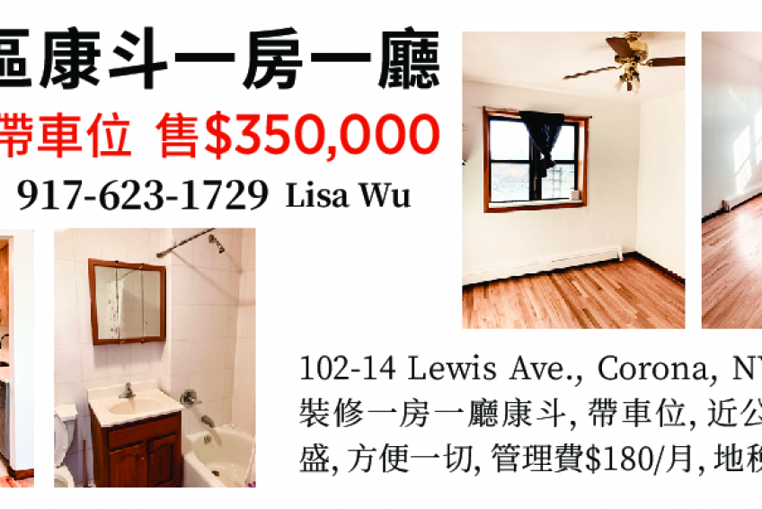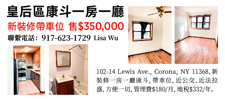 皇后區新裝修一房一廳 CONDO(康斗),帶車位,近公交、近法拉盛,方便一切,管理費每月$180,地稅每年$332,售$350,000