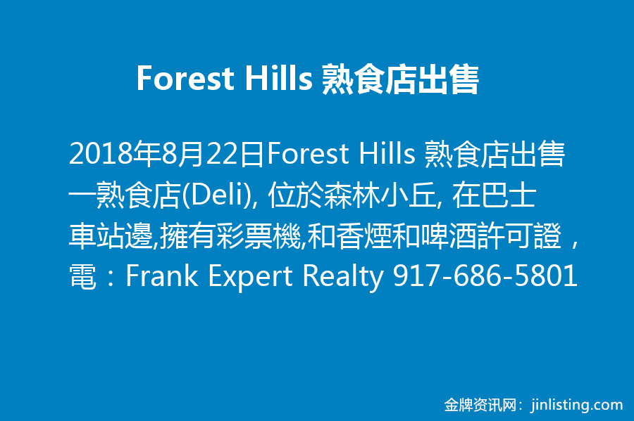 皇后區Forest Hills 熟食店出售 917-686-5801 718-544-2121