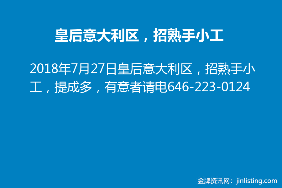 皇后意大利区,招熟手小工,提成多,有意者请电646-223-0124