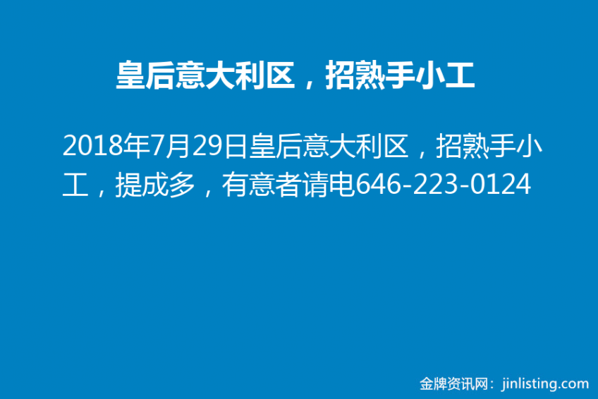 皇后意大利区,招熟手小工,提成多,有意者请电646-223-0124