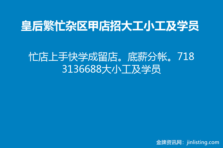 皇后繁忙杂区甲店招大工小工及学员忙店上手快学成留店。底薪分帐。7183136688大小工及学员