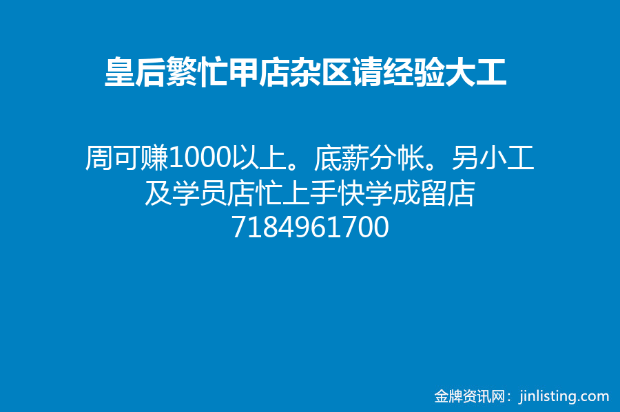 皇后繁忙甲店杂区请经验大工周可赚1000以上。底薪分帐。另小工及学员店忙上手快学成留店 7184961700
