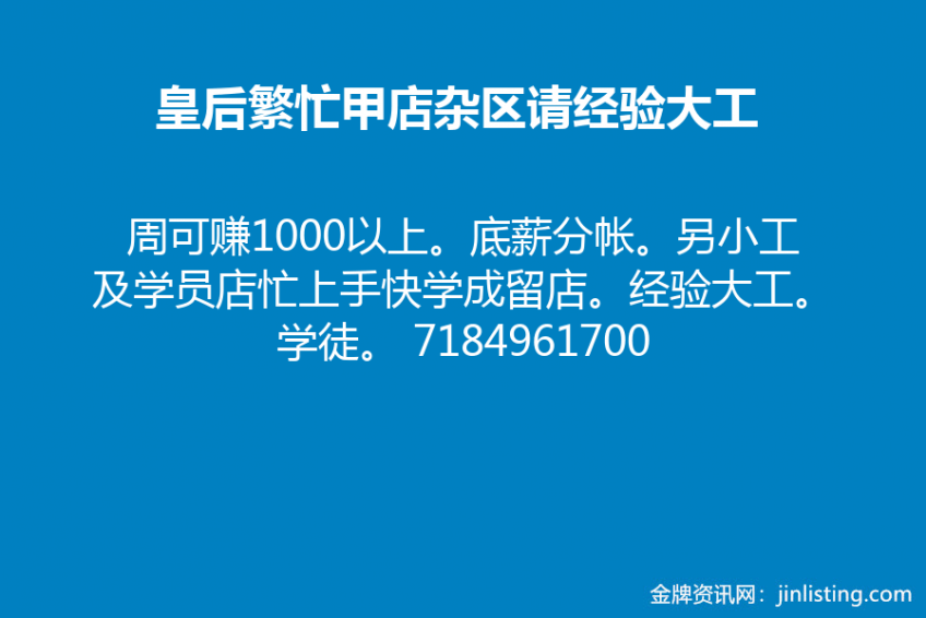 皇后繁忙甲店杂区请经验大工周可赚1000以上。底薪分帐。另小工及学员店忙上手快学成留店 7184961700。经验大工。学徒。