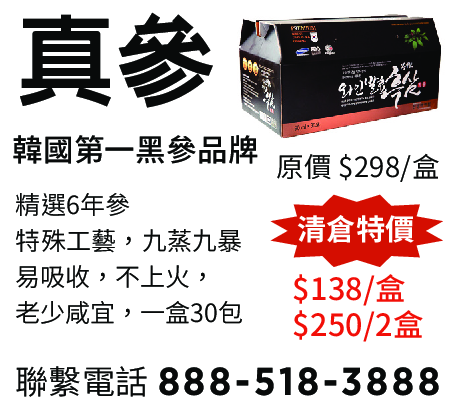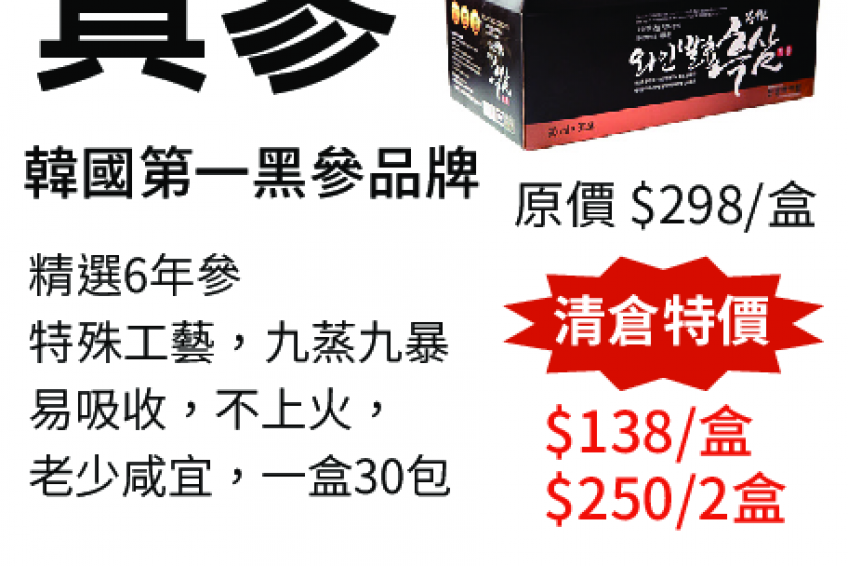 韓國第一黑參品牌,精選6年參,特殊工藝,九蒸九暴,易吸收,不上火,老少咸宜,一盒30包。