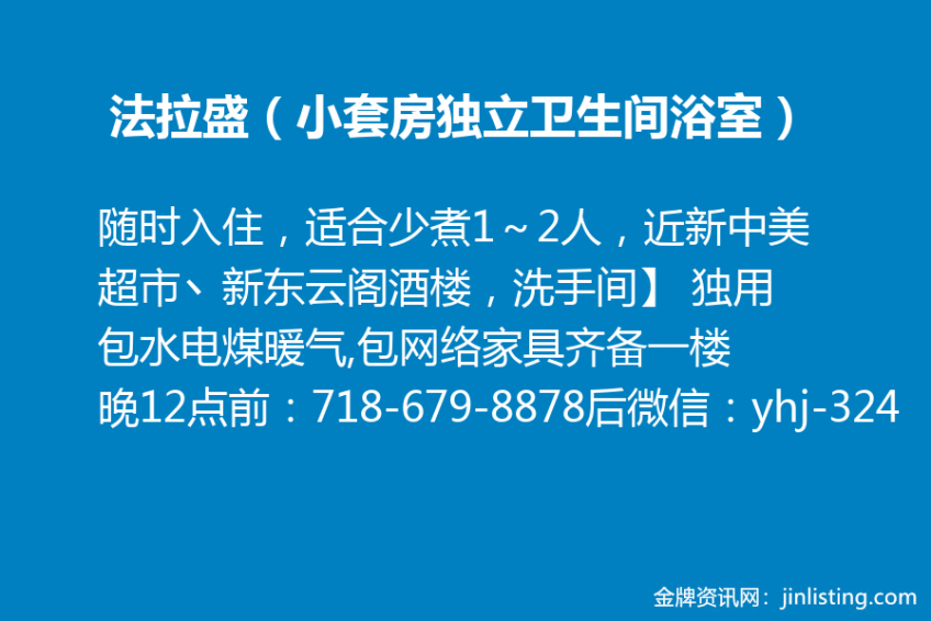 法拉盛新装修(小套房独立卫生间浴室)随时入住,适合少煮1~2人,近新中美超市丶新东云阁酒楼,交通方便,易停车不扫街,房间双人床等家具齐备,一楼方便搬行李,半独立出入,无中介,价格优惠,联系:718-679-8878 晚12点前可来电,12点后发短信 微信:yhj-324