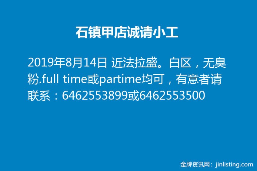 白石镇甲店诚请小工,近法拉盛。白区,无臭粉.full time或partime均可,有意者请联系:6462553899或6462553500