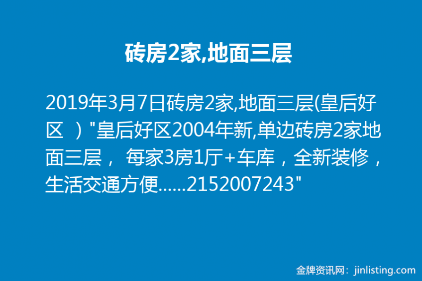 砖房2家,地面三层(皇后好区 ) “皇后好区2004年新,单边砖房2家地面三层, 每家3房1厅+车库,全新装修, 生活交通方便。 R4-1地,18.83×100,屋18.83×52,税 $7530。 过户清空,开价$108万! 看房从速,请电或微信何Henry 2152007243”