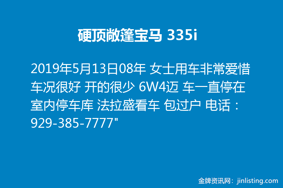 “硬顶敞篷宝马 335i 08年 女士用车非常爱惜 车况很好 开的很少 6W4迈 车一直停在室内停车库 法拉盛看车 包过户 电话:929-385-7777”