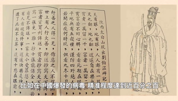 刘伯温留下的预言,小到预言家族运数,大到预言近代中国大事件,如国共内战、日本侵华、中共统治,以及中共篡政后的统治情况,其精准程度令后人叹为观止。刘伯温的《烧饼歌》、《太白山刘伯温碑记碑记》、《推碑图》和《金陵塔碑文》预言当今中国社会将要发生的事件,比如在中国爆发的病毒,精准程度达到近百分之百。
