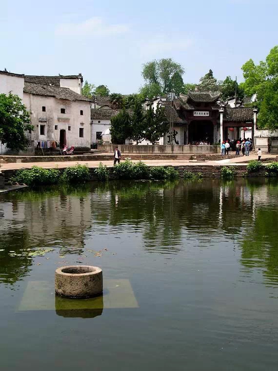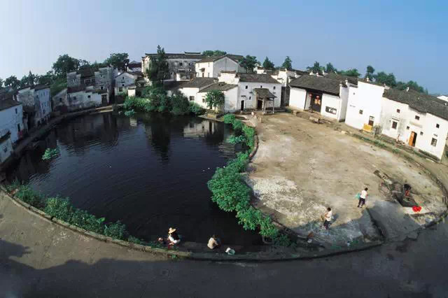 诸葛八卦村的地形如锅底,中间低平,四周渐高。四方来水,汇聚锅底,形成一口池塘,称为钟池。钟池是诸葛八卦村的核心所在,也是布列“八阵图”的基点。钟池并不大,但这口池塘半边有水,半边为陆,形如太极,奇妙无比。