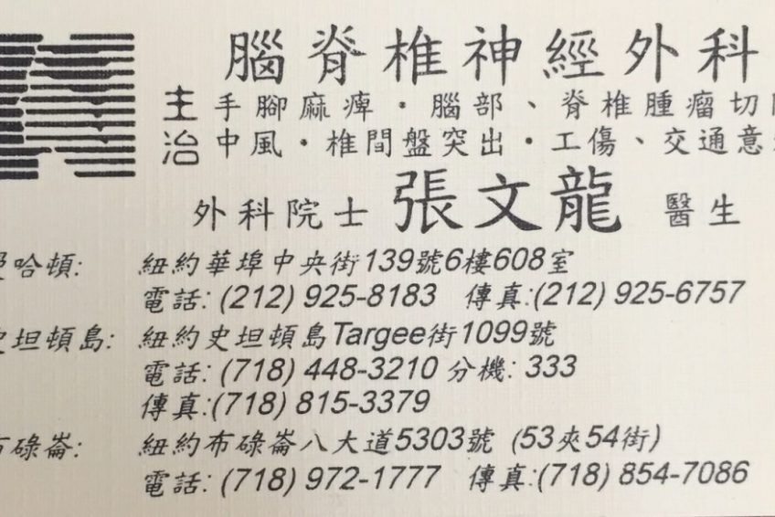 腦脊椎神經外科: 張文龍醫生(212)925~8183 纽约华埠中央街道139号6楼608室