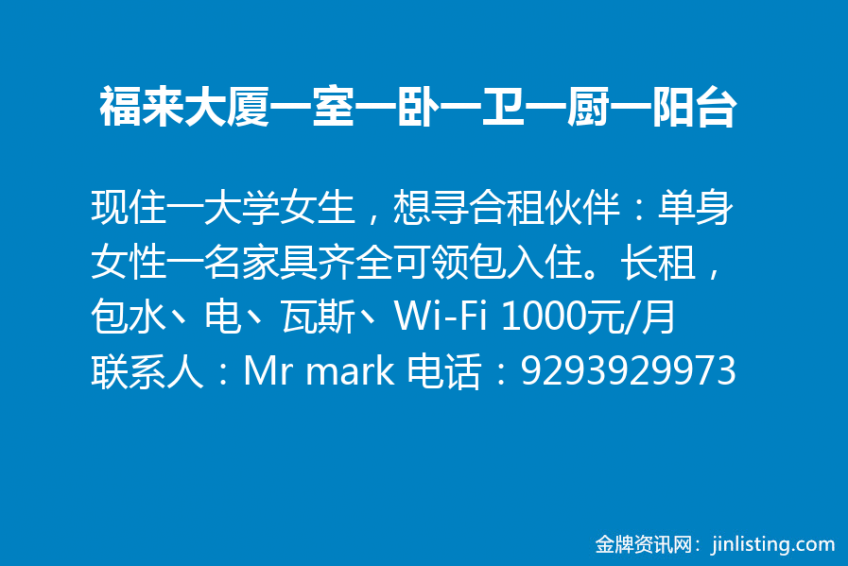 福来大厦138-35 Elder AVE(近凯西娜和缅街) ,有房出租,大楼24小时有doorman,安全系数高。原本是2房2厅2卫1厨1阳台,现住一大学女生,想寻合租伙伴:单身女性一名。可拥有1房1卫,共用厨房丶阳台丶客厅。房间空气流通,宽大明亮丶家具齐全可领包入住。长租,包水丶电丶瓦斯丶Wi-Fi 1000元/月
