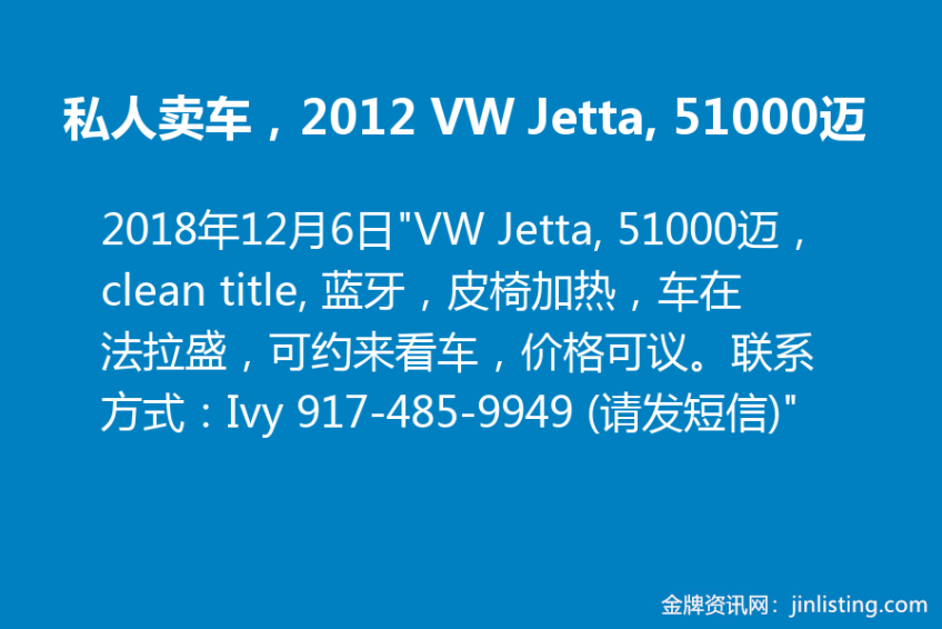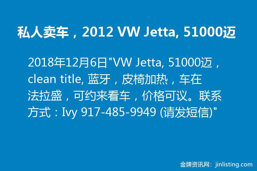 私人卖车,2012 VW Jetta, 51000迈, $7500 917-485-9949