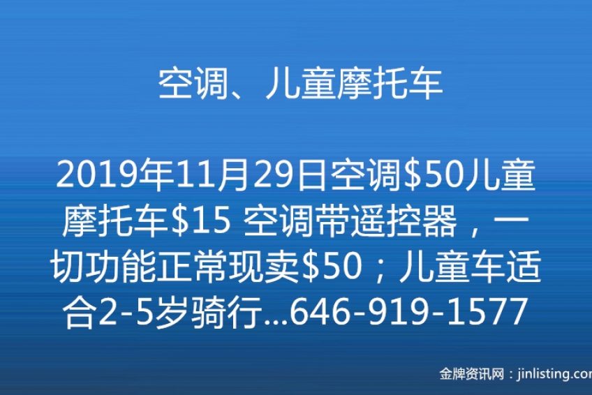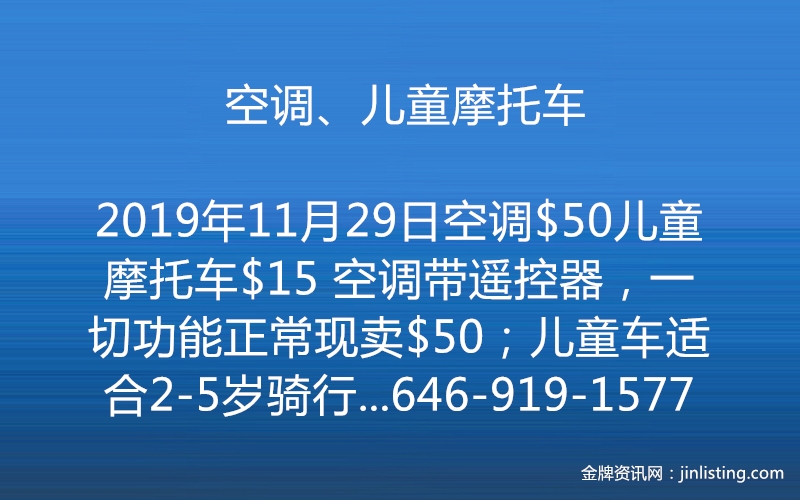 空调$50儿童摩托车$15 空调带遥控器,一切功能正常现卖$50;儿童车适合2-5岁骑行,车座位里面可放东西,很新,买来只骑出去过一次,现卖$15。新鲜草原自取,电话646-919-1577