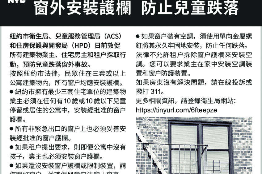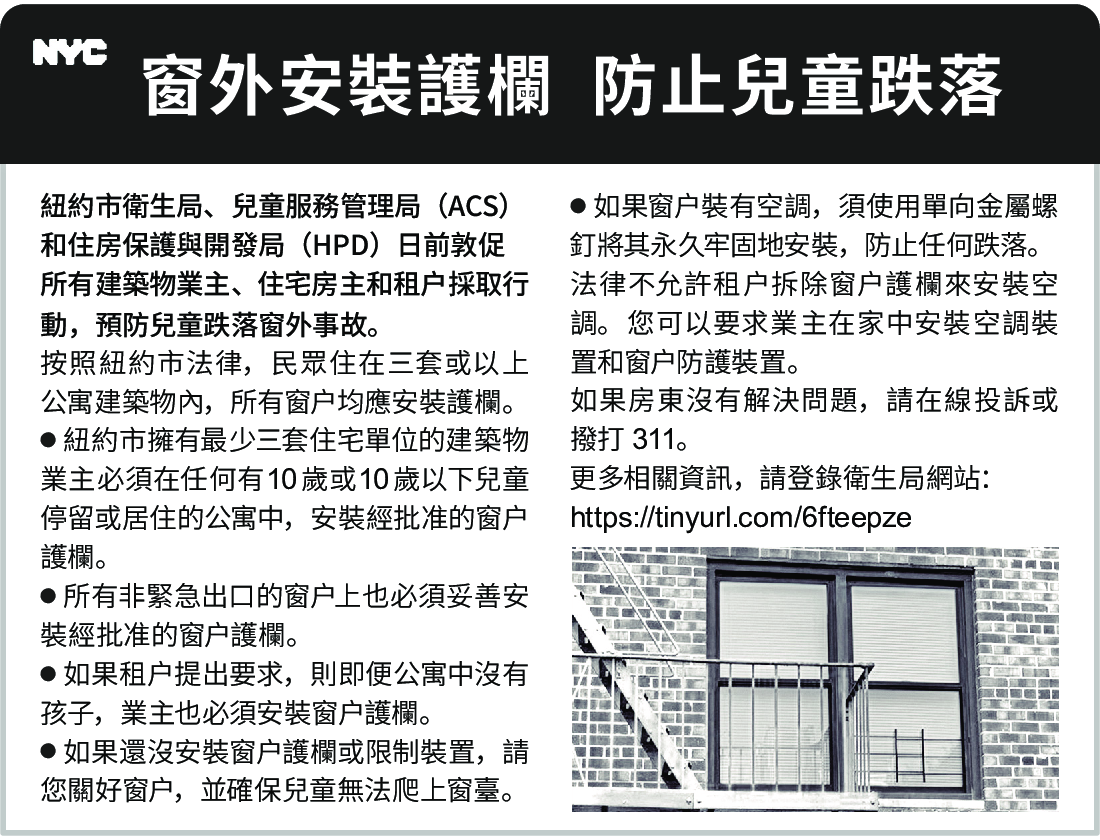 ● 紐約市擁有最少三套住宅單位的建築物業主必須在任何有10歲或10歲以下兒童停留或居住的公寓中,安裝經批准的窗戶護欄。