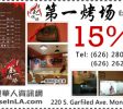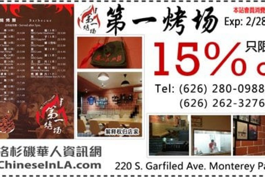 『第一烤場』洛杉磯最正宗地道的碳烤燒烤店!羊肉豬肉雞翅排骨板筋魷魚腰子玉米蘑菇茄子尖椒韭菜大蒜火燒蝦蠔蛤蜊最全的燒烤場!環境以木質磚牆混搭各種老物件,打造清新七八九零年代懷舊主題。美食帶你回憶過去,回憶地道中國北方烤肉感覺!各路吃貨不能錯過的品質好店!鎮店之寶:烤雞翅,秘製烤排骨。地址: 220 S. Garfiled Ave. Monterey Park, CA營業時間: 5pm~次日2am 每天本店近新推出羊肉湯,用料考究,製作精細,湯汁乳白,味道鮮美,民間素有冬吃羊湯賽人參,春夏秋食亦強身的說法,實乃冬季飲食佳品!出示此信息,點羊肉湯送小菜兩份。歡迎前來品嚐!