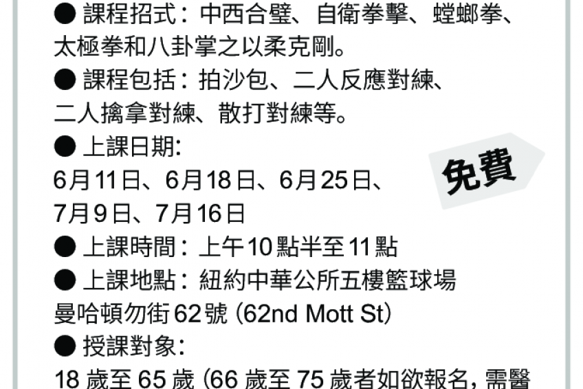 ● 課程招式:中西合璧、自衛拳擊、螳螂拳、