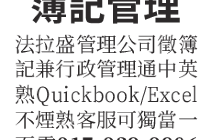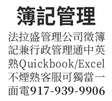 法拉盛管理公司徵簿記兼行政管理通中英熟Quickbook/Excel不煙熟客服可獨當一面917-939-9906