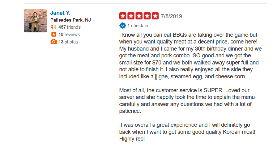 Janica G.老实说,我不明白为什么这个地方还没有达到5星评级,因为它是我去过的最好的kbbq地方之一,这不是所有你可以吃但是完全公平的价格和你正在吃的量。我喜欢它,因为里面有如此大的空间,你不觉得你不能从烟雾或任何东西呼吸(它们保持着烧烤的烟雾非常好btw)。