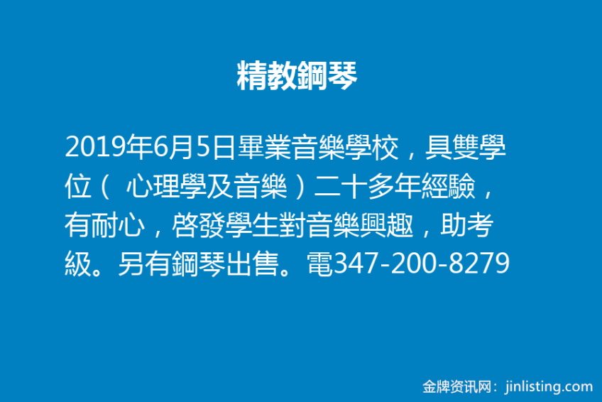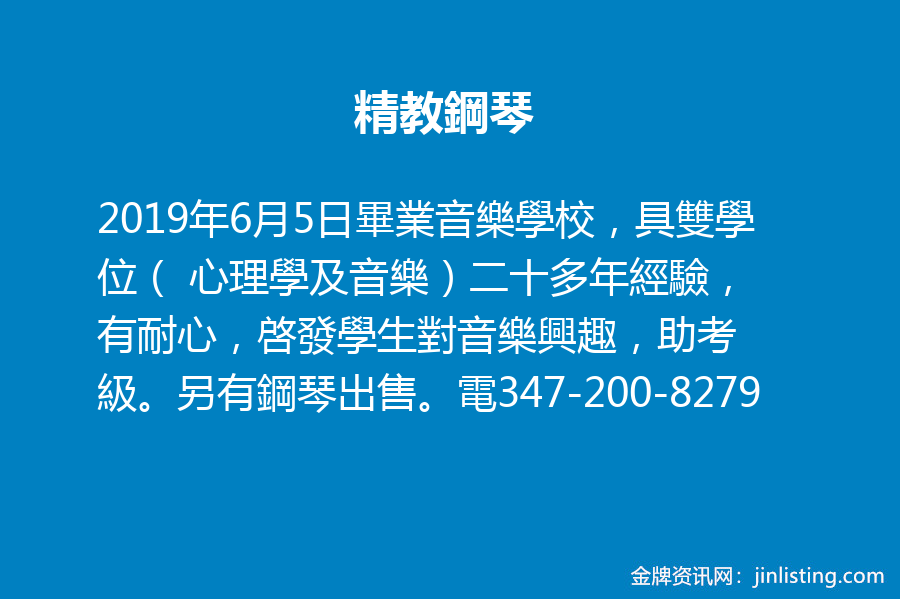 畢業音樂學校,具雙學位( 心理學及音樂)二十多年經驗,有耐心,啓發學生對音樂興趣,助考級。另有鋼琴出售。電347-200-8279