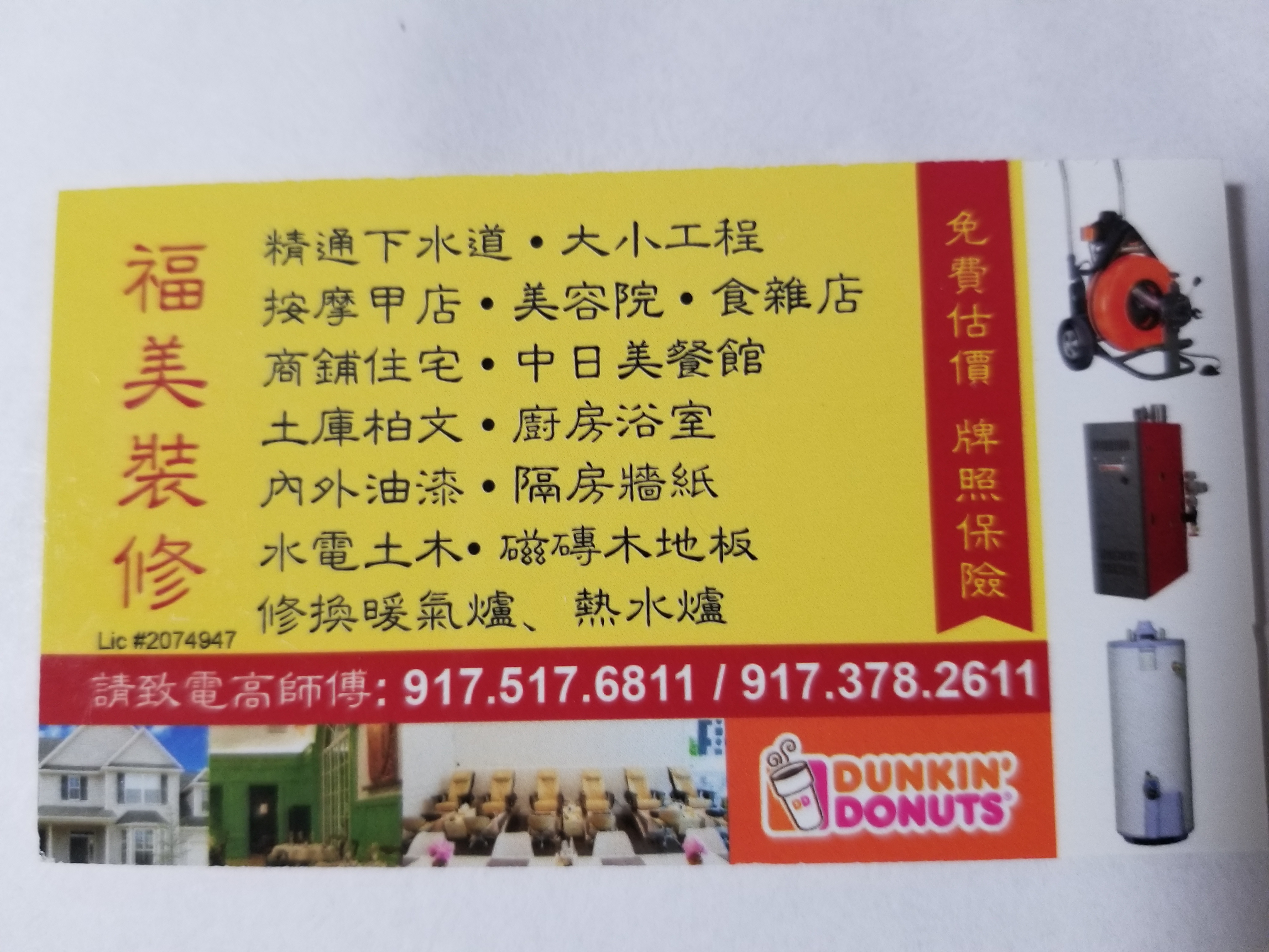 精通下水道, 修各式家用冰箱,安装维修暖气炉/热水炉, 修车库电动门,水电每层分表, 铺换地板, 内外油漆, 隔房, 卫生间, 按摩店,指甲店, 食杂店,99店,中日餐馆 家庭内外, 商业住宅, 水电土木水泥, 三十多年经验,大小工程, 免费估价, 只收工钱, 质量保证. 政府注册 执照保险