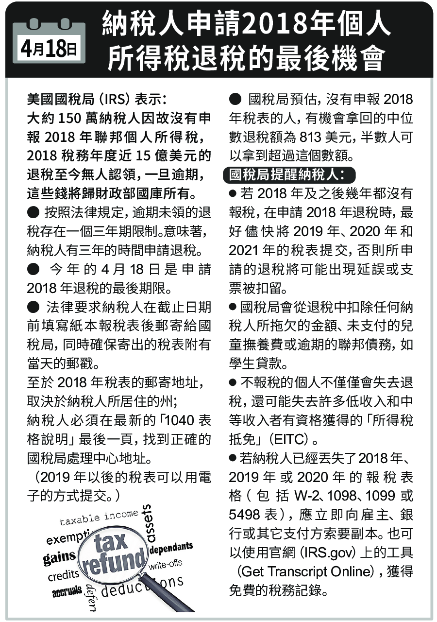 大約150萬納稅人因故沒有申報2018年聯邦個人所得稅,2018稅務年度近15億美元的退稅至今無人認領,一旦逾期,這些錢將歸財政部國庫所有。