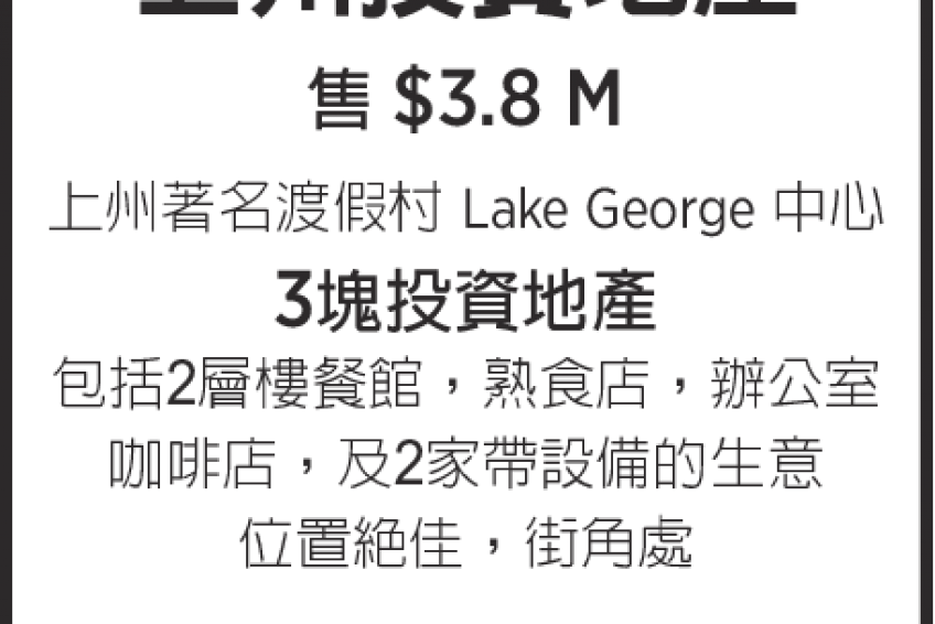上州著名渡假村Lake George中心, 3塊投資地產,包括2層樓餐館,熟食店,辦公室,咖啡店,及2家帶設備的生意,位置絕佳,街角處,售$3.8 M