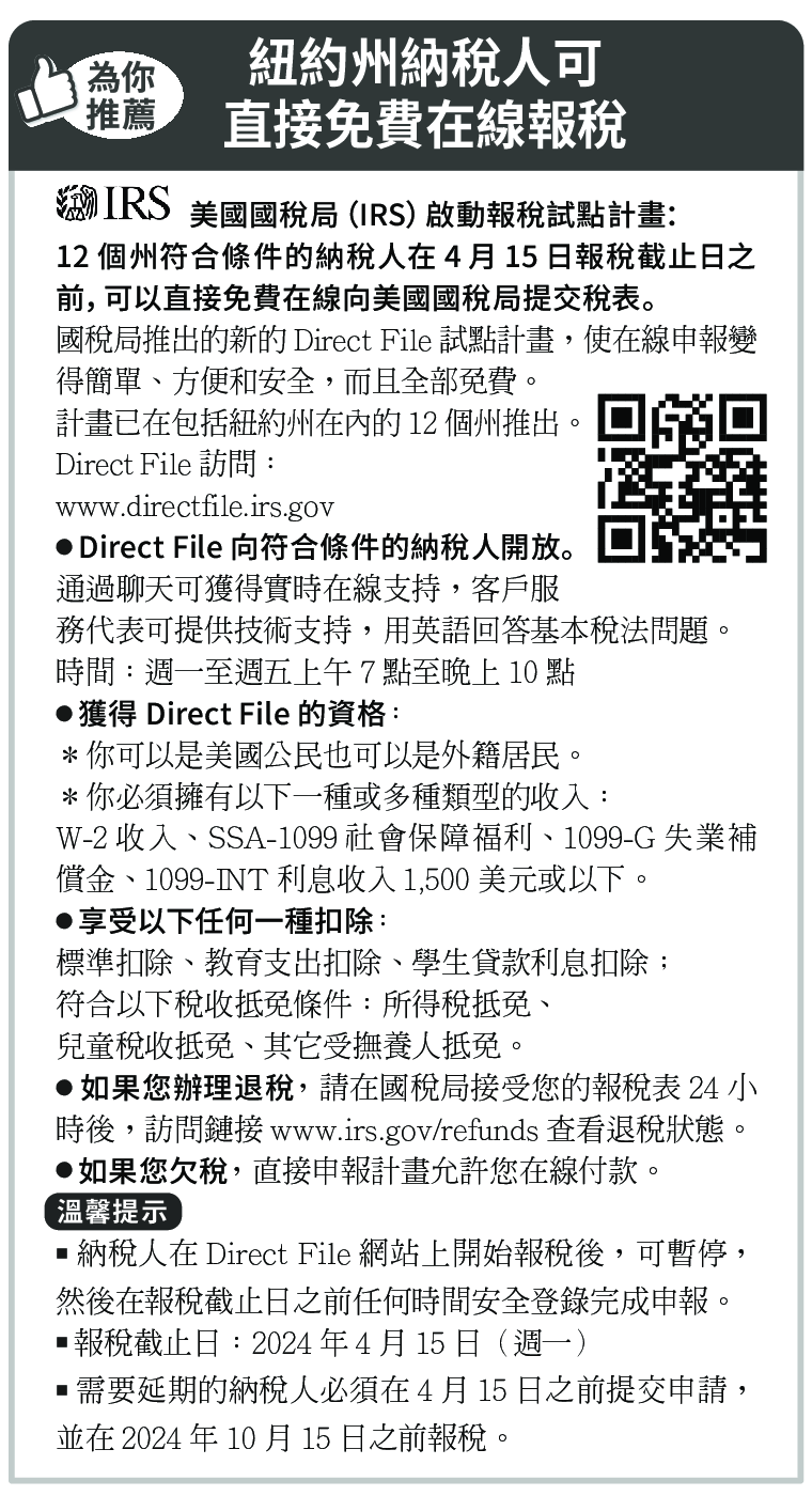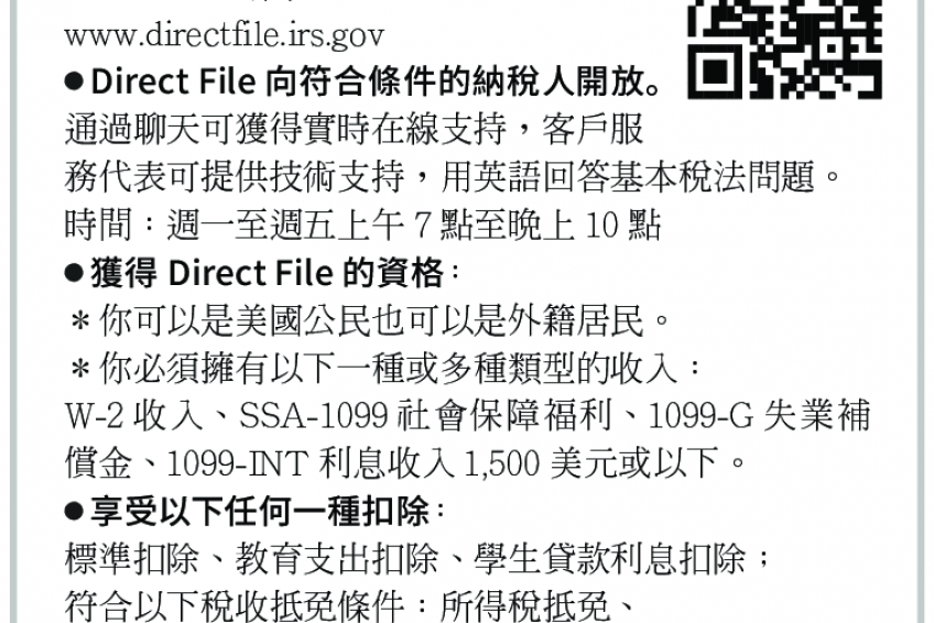 n 納稅人在Direct File網站上開始報稅後,可暫停,然後在報稅截止日之前任何時間安全登錄完成申報。n 報稅截止日:2024年4月15日(週一)n 需要延期的納稅人必須在4月15日之前提交申請,並在2024年10月15日之前報稅。