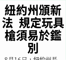 8月16日,紐約州長霍楚簽署新法律,仿真玩具槍必須易於鑑別,如採用鮮豔色彩或透明材料製造。