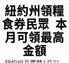 ● 紐約市以外所有縣的領取糧食券家庭,可在4月22日之前領到額外福利。
