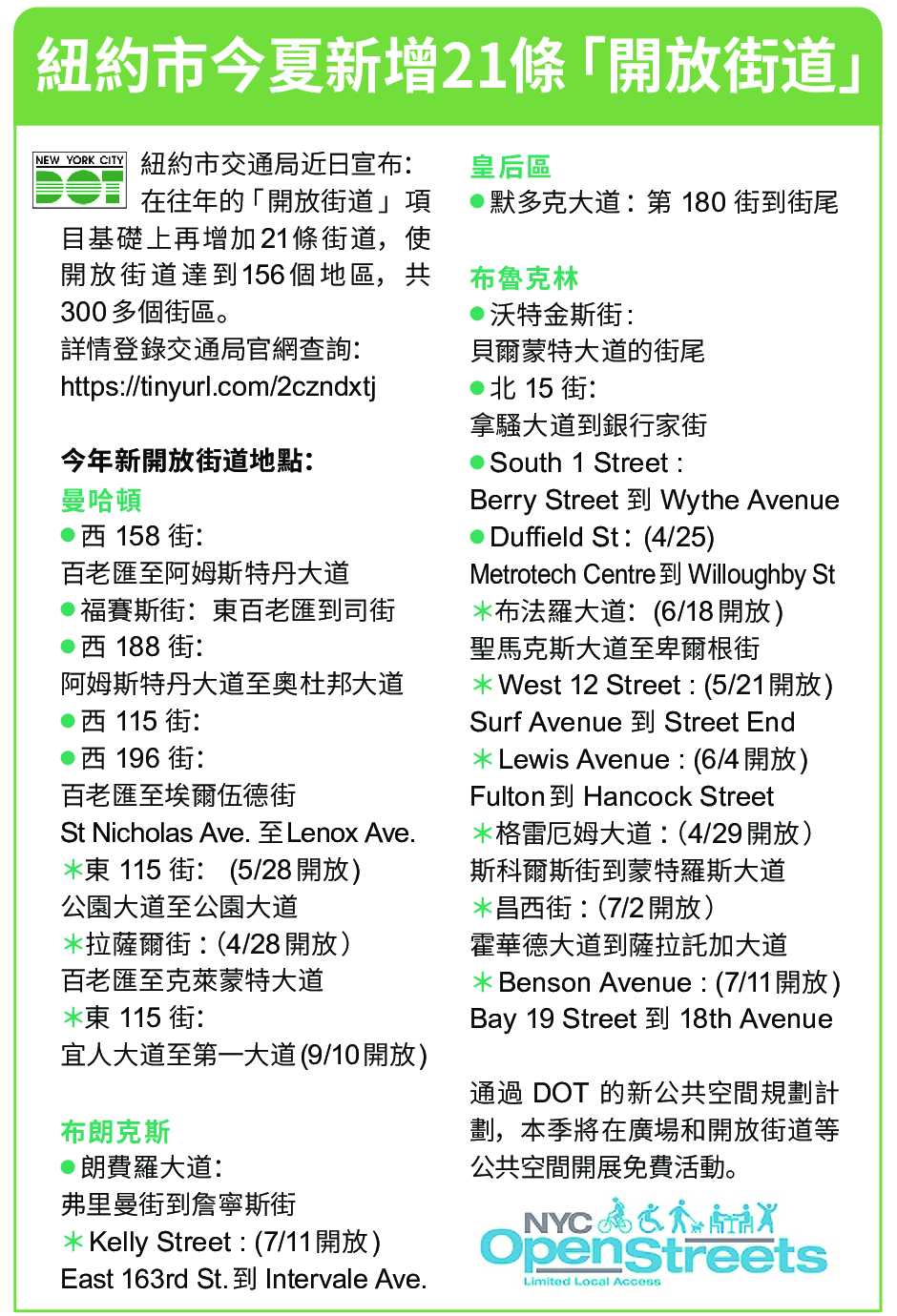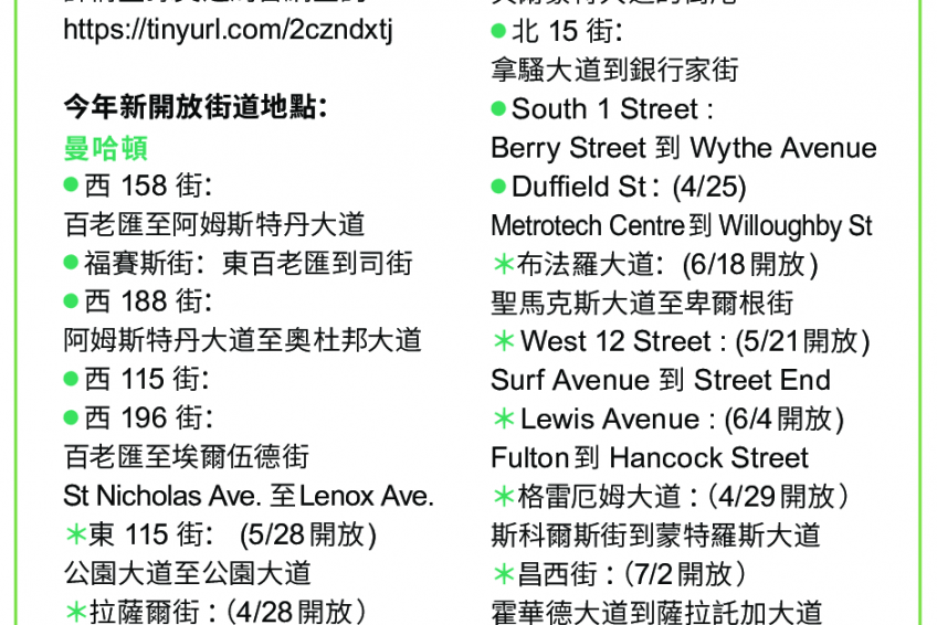 在往年的「開放街道」項目基礎上再增加21條街道,使開放街道達到156個地區,共300多個街區。