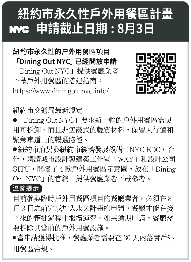 紐約市永久性戶外用餐區計畫 申請截止日期: 8月3日