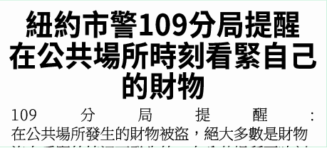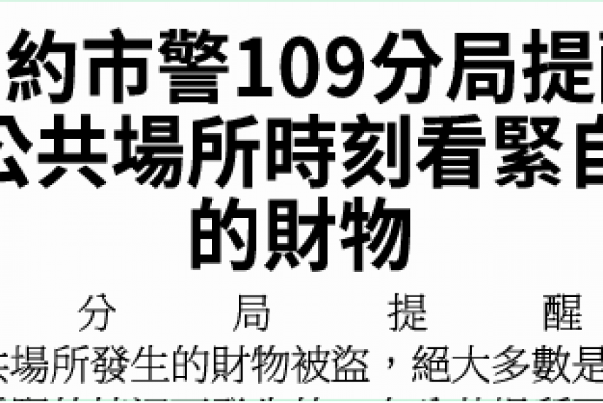 紐約市警109分局提醒 在公共場所時刻看緊自己的財物