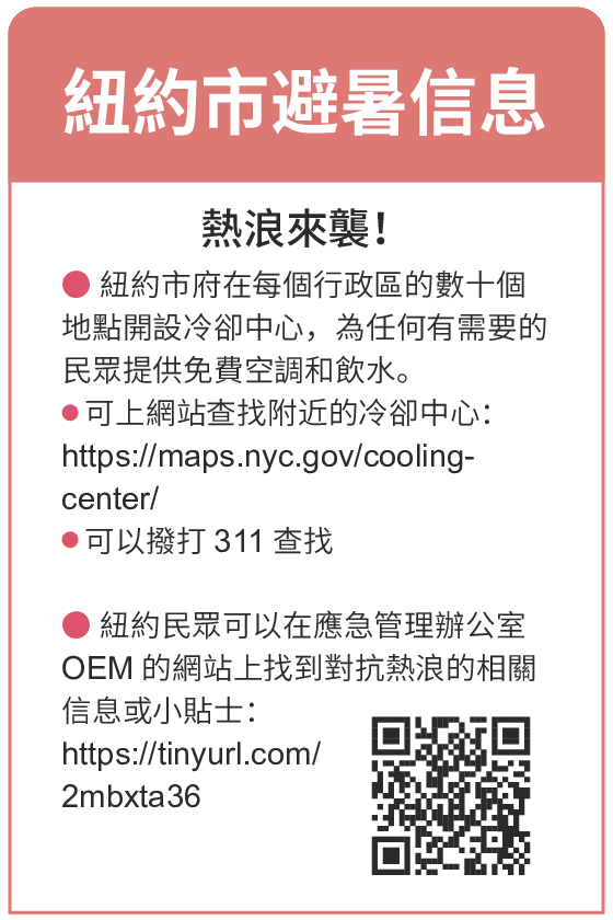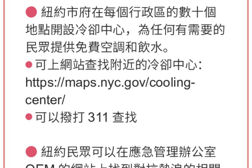 ● 紐約市府在每個行政區的數十個地點開設冷卻中心,為任何有需要的民眾提供免費空調和飲水。