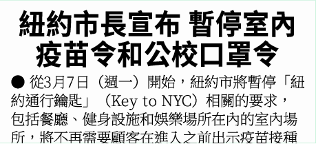 ● 從3月7日(週一)開始,紐約市取消對公立學校K-12年級的室內口罩要求。