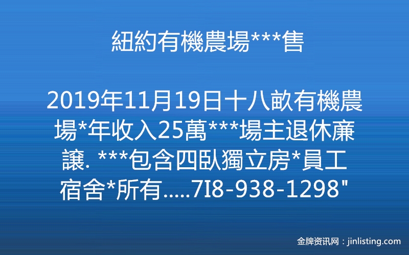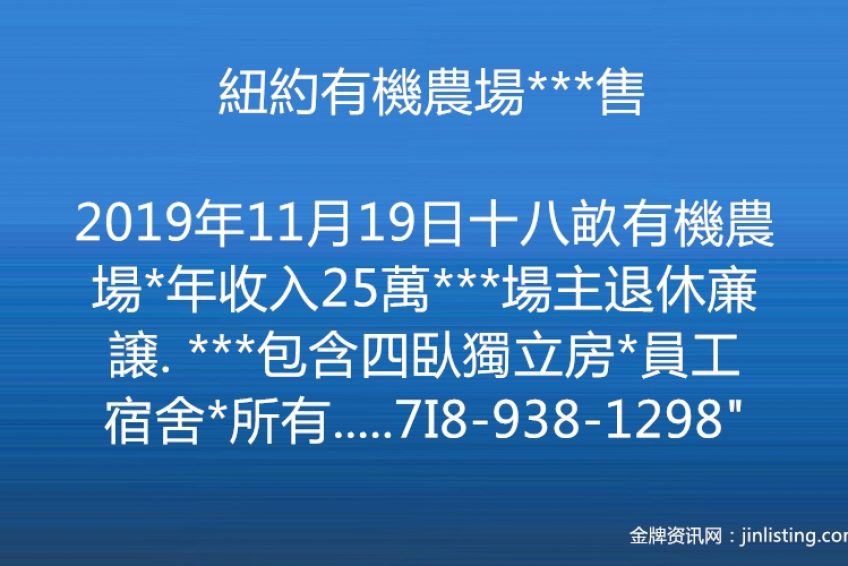 ***紐約有機農場***售*** “***十八畝有機農場*年收入25萬***場主退休亷譲. ***包含四臥獨立房*員工宿舍*所有生財農具*工作貨車*等等*** ***交接後*場主專業輔導*可做農家樂*食品加工廠*休閒養生*投資移民*等等*** *多元化發展*多方面經營使用*開車五十分鐘到法逹盛*** *開車十分鐘長島火車站,直達伍德賽/曼哈噸*** 詳情電話連絡7I8-938-1298”