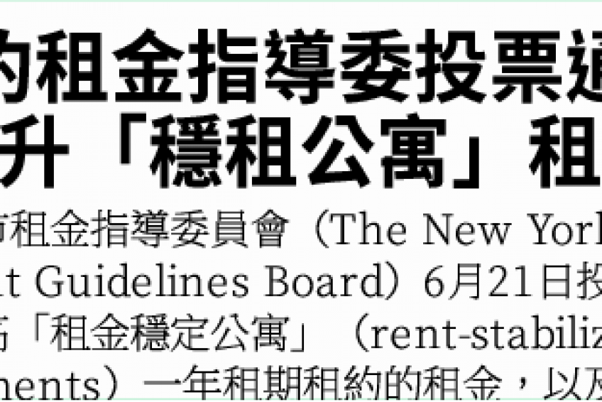 紐約租金指導委投票通過 提升「穩租公寓」租金