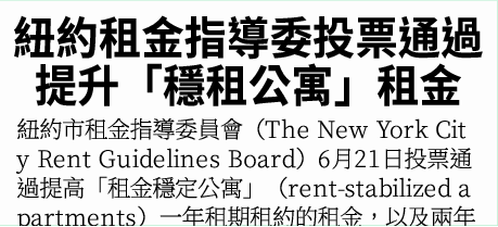 6月21日投票通過提高「租金穩定公寓」(rent-stabilized apartments)